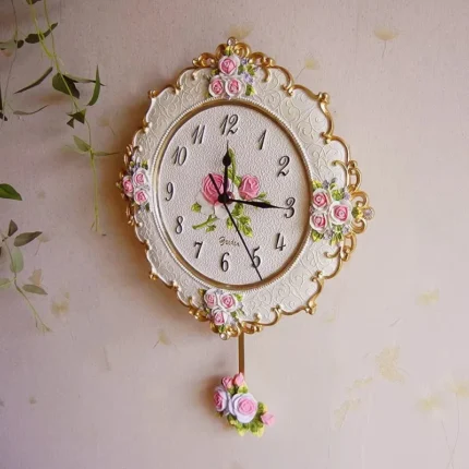 European Retro resin Pastoral quartz clock Mute style wall clock Muted fashion rose flower round wall clock