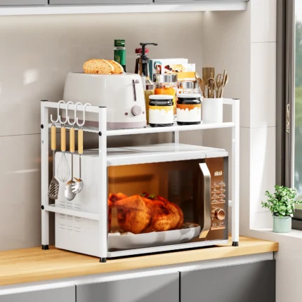 Material: Metal 2 Tier Microwave Shelf Stainless Steel Expandable Shelf and Organiser for Kitchen Worktops with 3 Hooks White/Black Product Dimensions