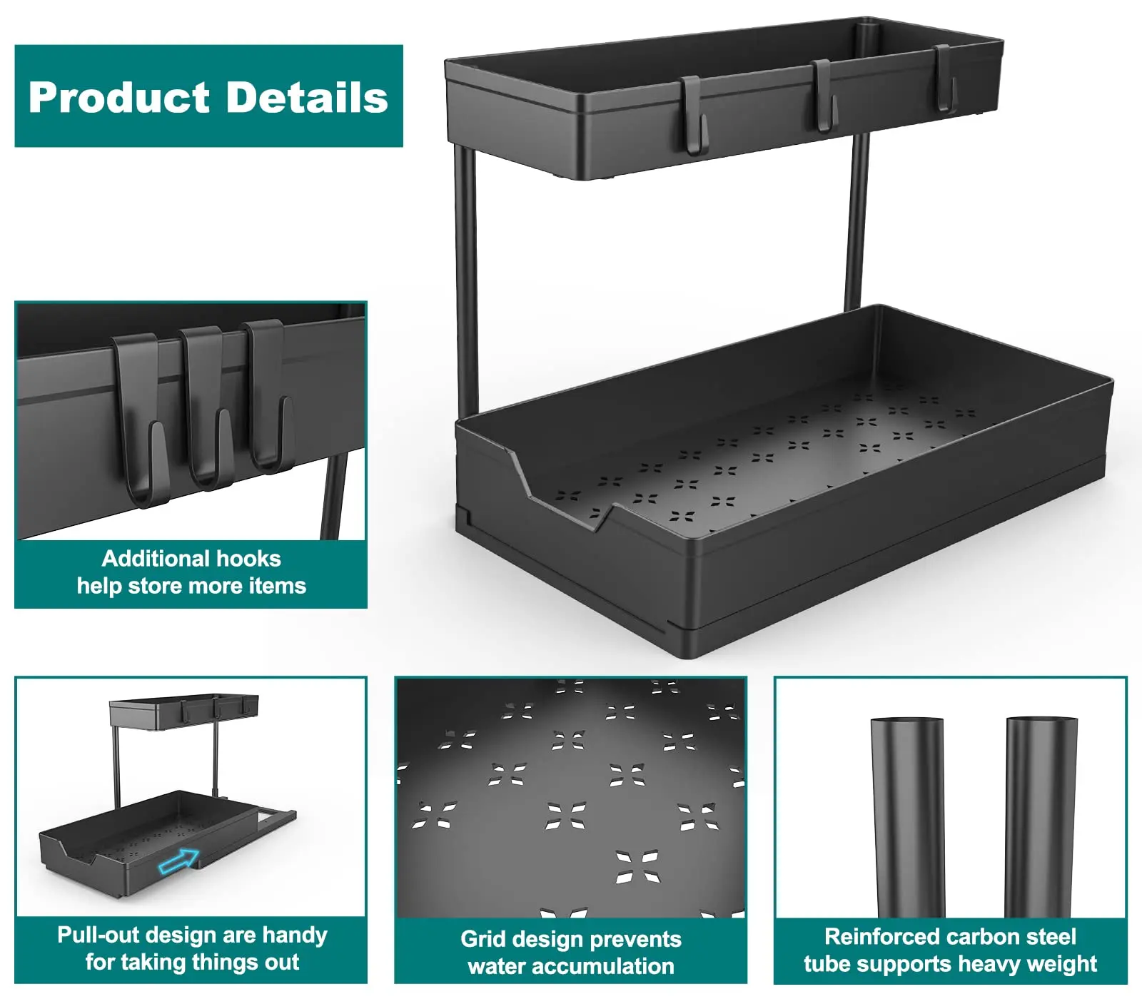 【Stability Construction】- This under sink organizers and storage is made of thick plastic material which can help you better store your items and look clean and tidy. The four sturdy tubes with protective coating prevent rust in wet and watery places.
