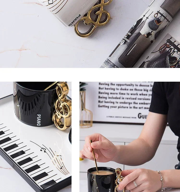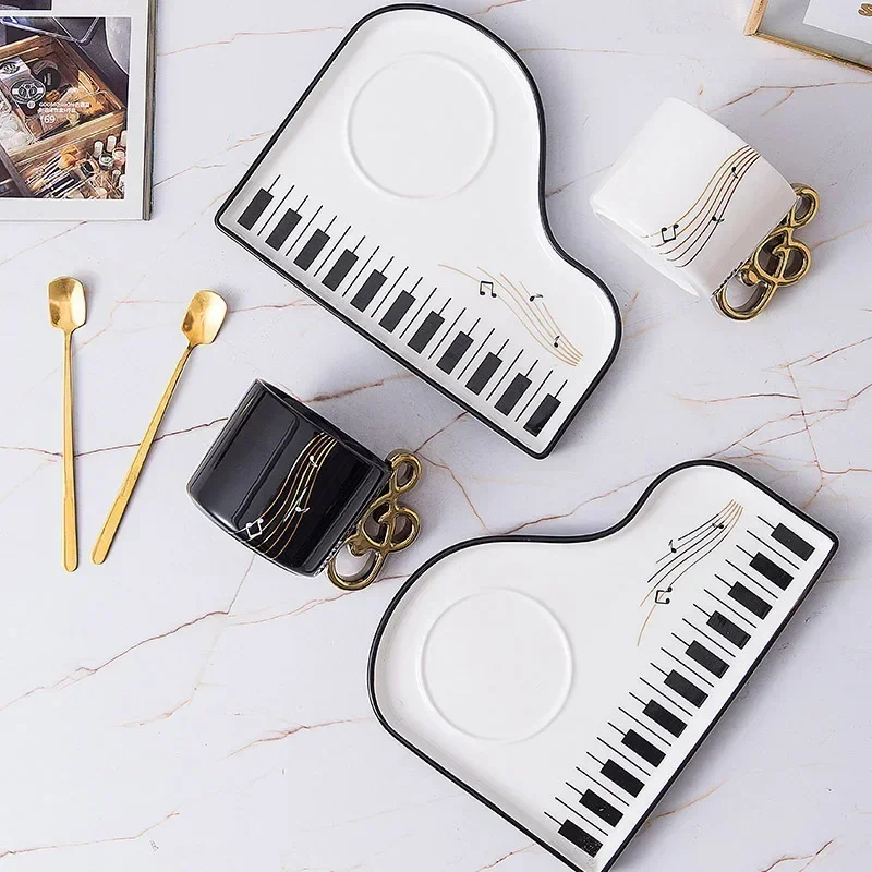 200ml Creative Piano Coffee Mugs with Plate Set Ceramic Mug Music Handle with Spoon Afternoon Tea Tableware Breakfast Milk Cup