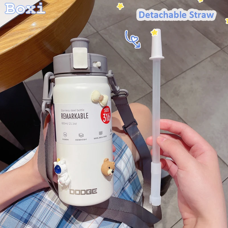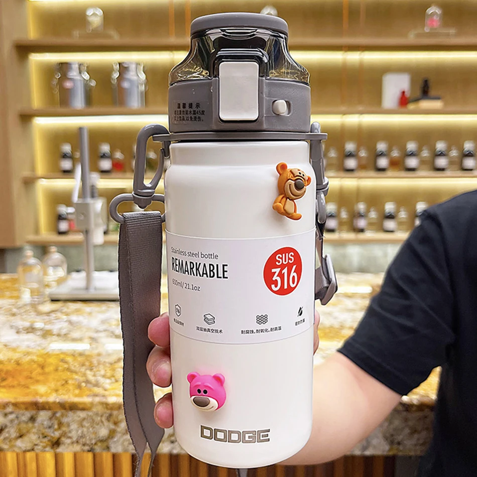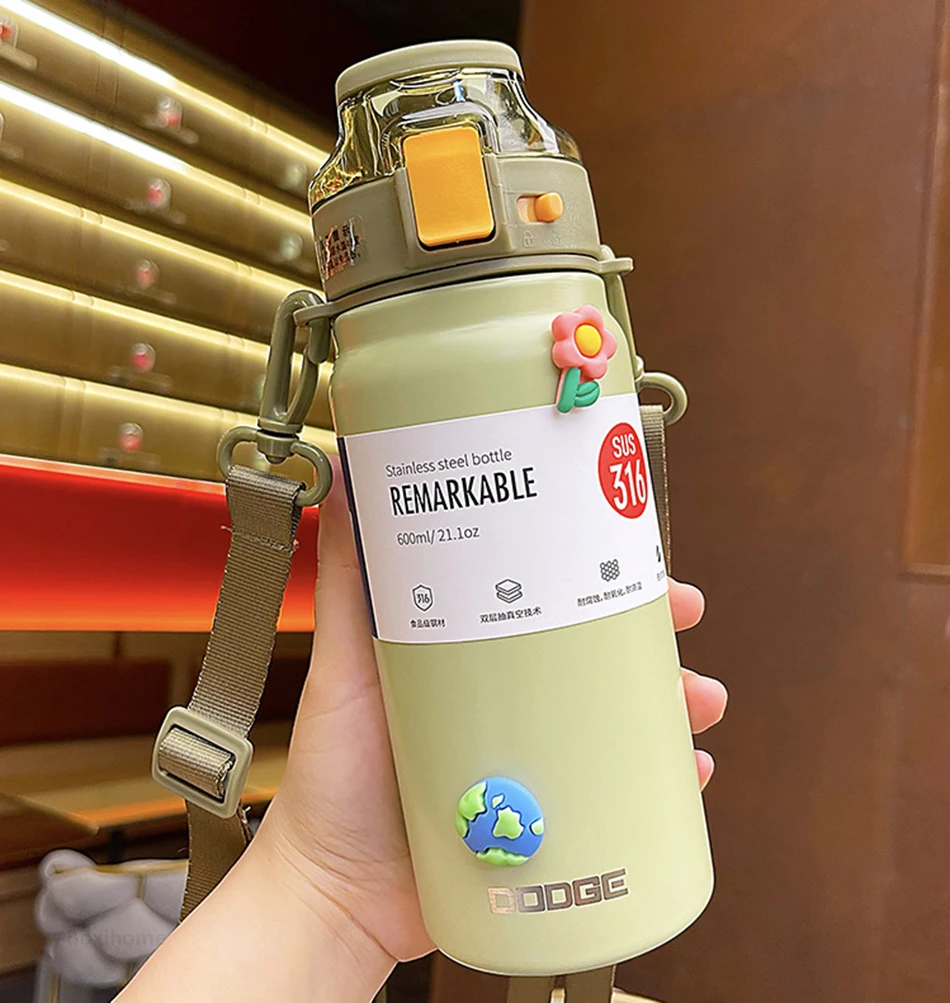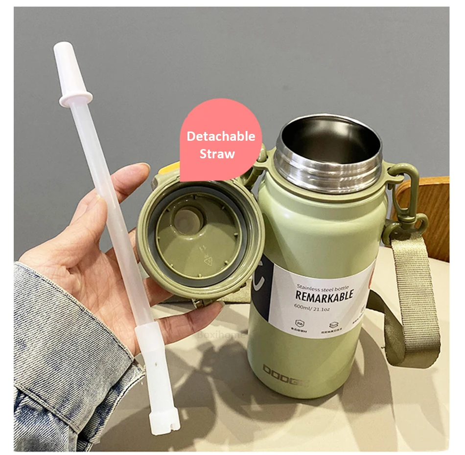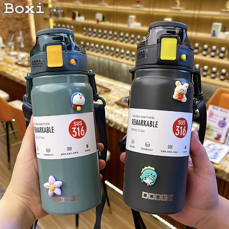 21oz 316 Stainless Steel Thermos Water Bottle For Girls With Straw Portable Strap Large Sports Thermal Insulated Vacuum Flask