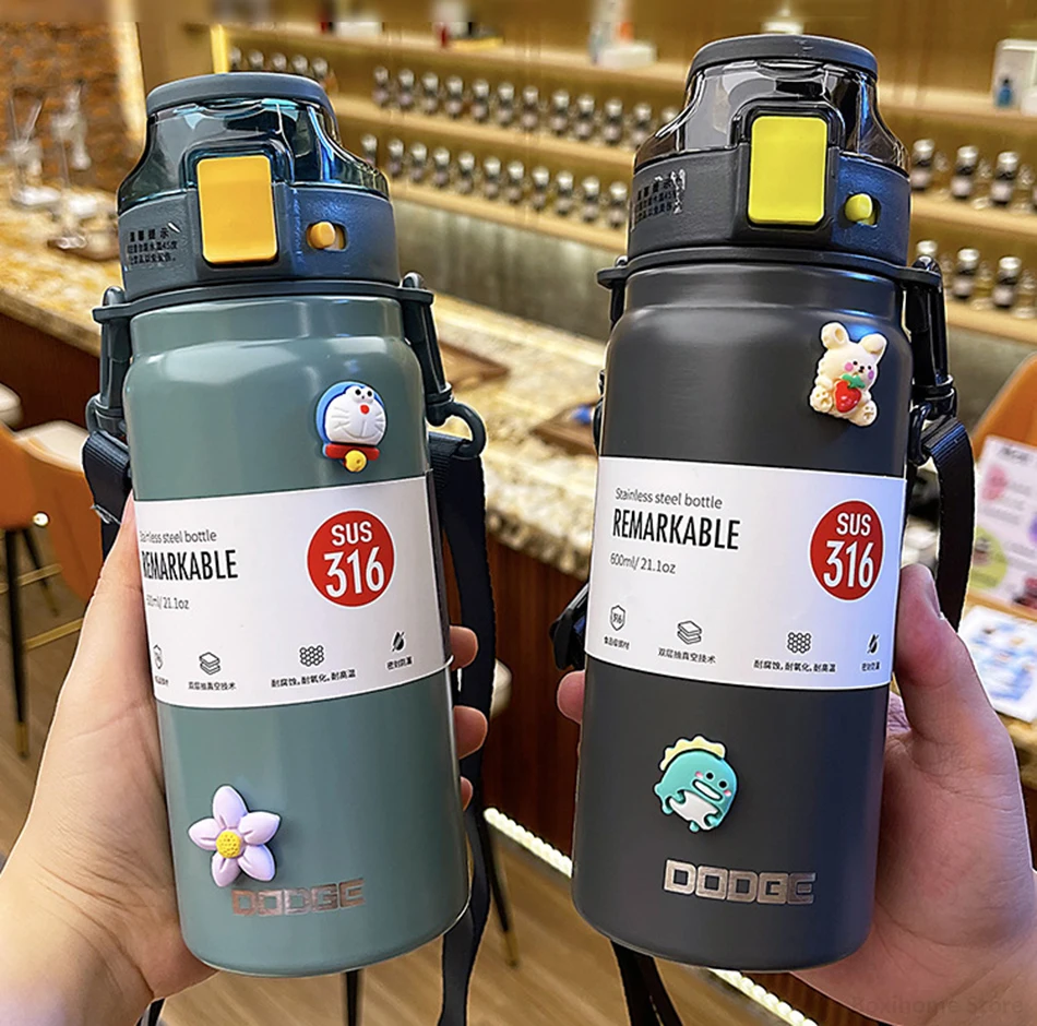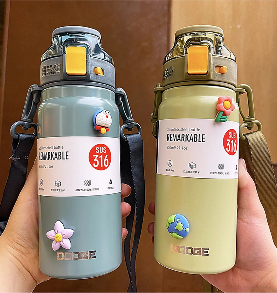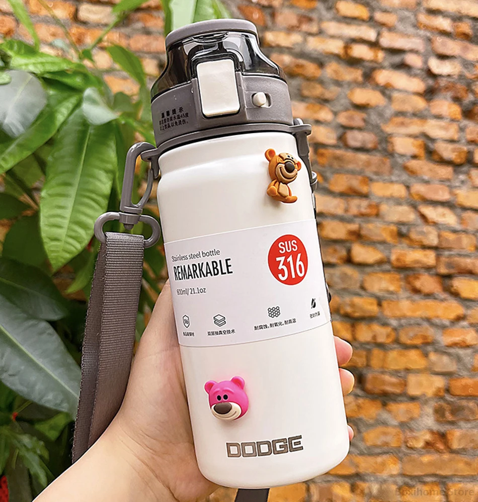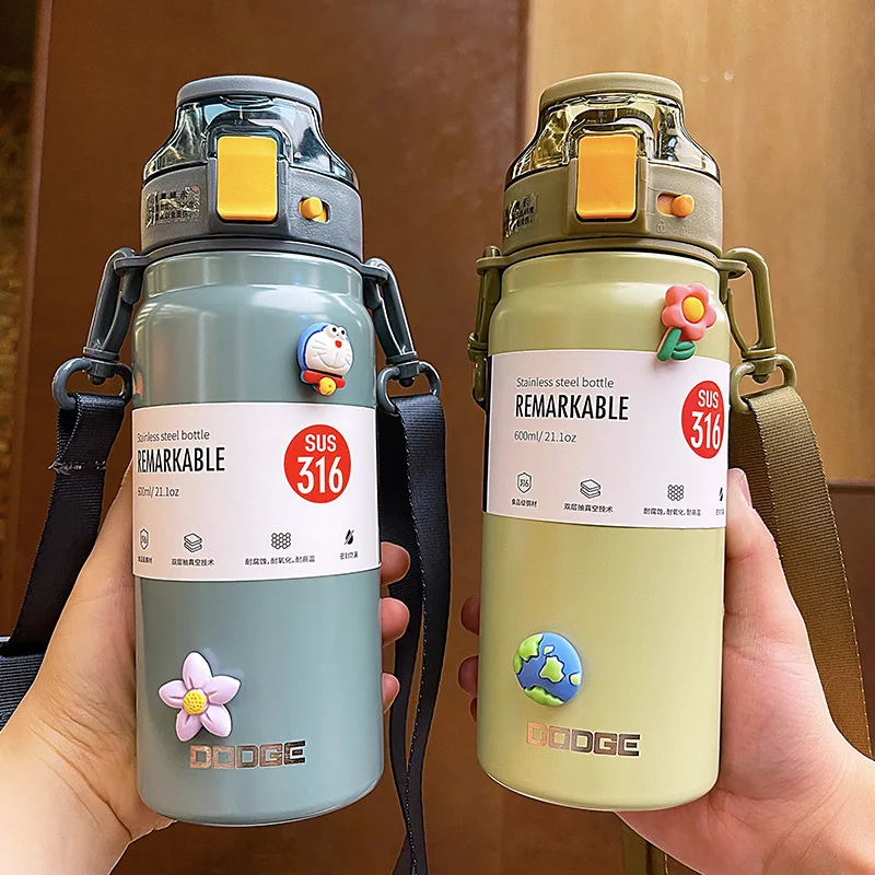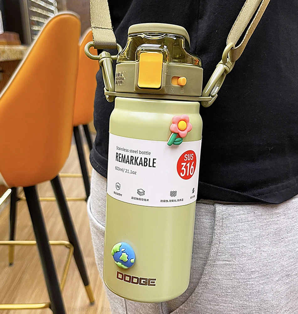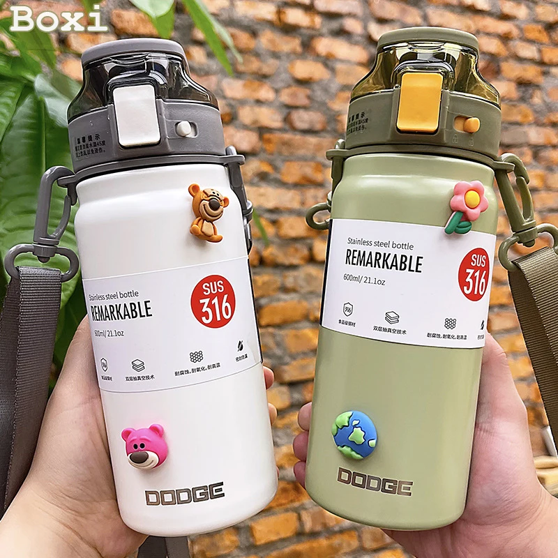 21oz 316 Stainless Steel Thermos Water Bottle For Girls With Straw Portable Strap Large Sports Thermal Insulated Vacuum Flask
