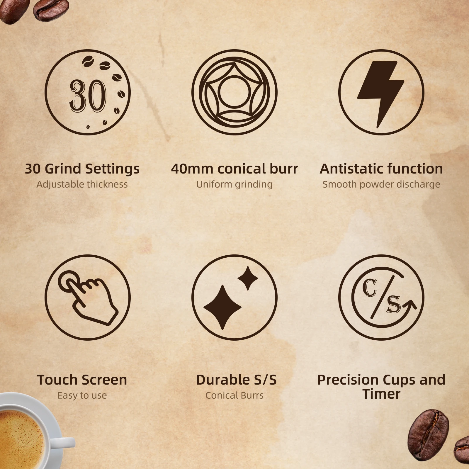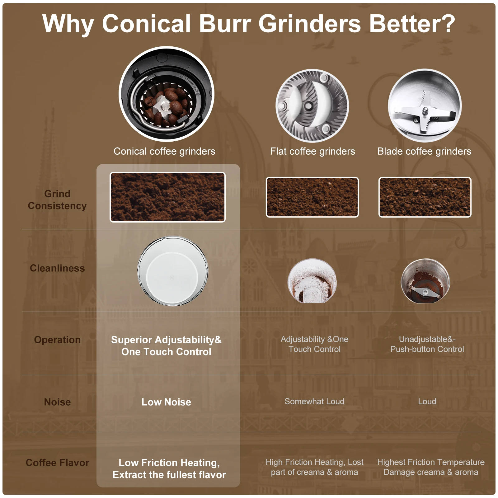 【Durable Conical Burr 】- 40 millimeter stainless steel conical burrs designed to minimize grinding heat and protect the essential oils in the coffee bean, creating consistent coffee grounds and optimal flavor extraction.