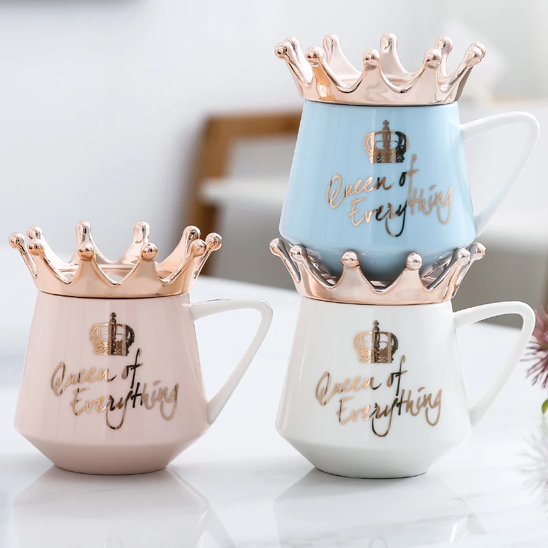 Creative Crown Mug,Multi Color mugs with spoon lid Coffee Milk Cup Cute Ceramic Mug 300ml Capacity Water Cups X-Mas Gift