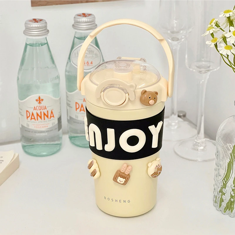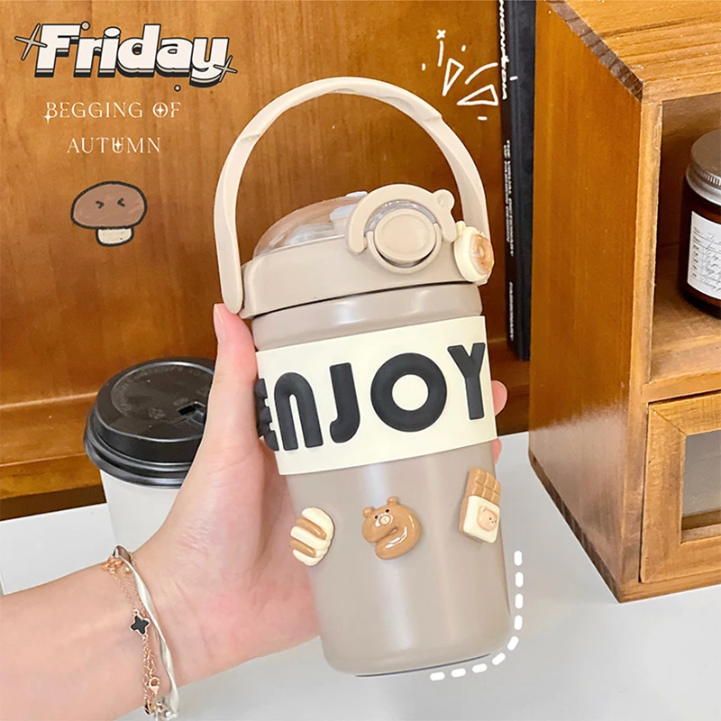 Cute Stainless Steel Thermos Water Bottle With Straw Handle Portable Vacuum Flask Insulated Thermal Coffee Cup Tumbler 450ml