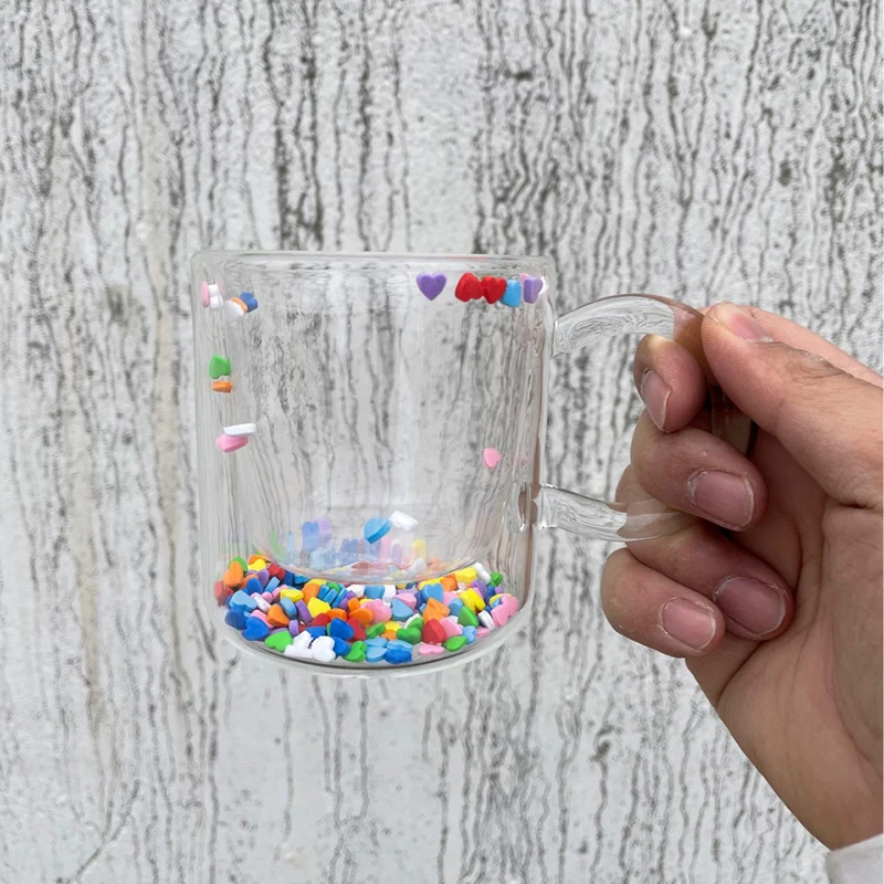 Holaroom Multicolor Heart Shaped Quicksand Cup Creative Double Layer Glass Cup Coffee Mug Milk Tea Juice Water Glass Drinkware