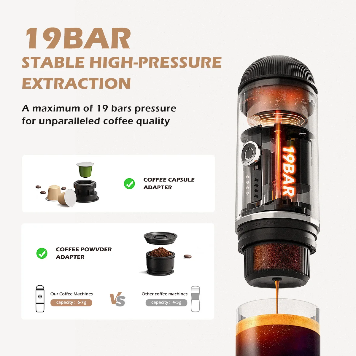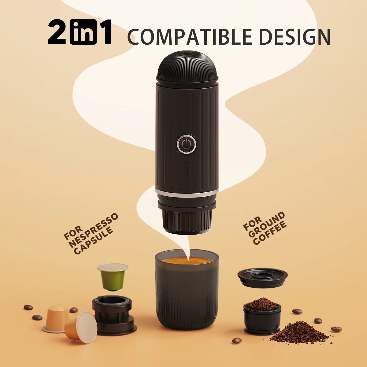 Portable 2 In1 Espresso Machine, Compatible Capsules and Ground Coffee,19 Bar Pressure,Perfect for Kitchen Travel,Camping
