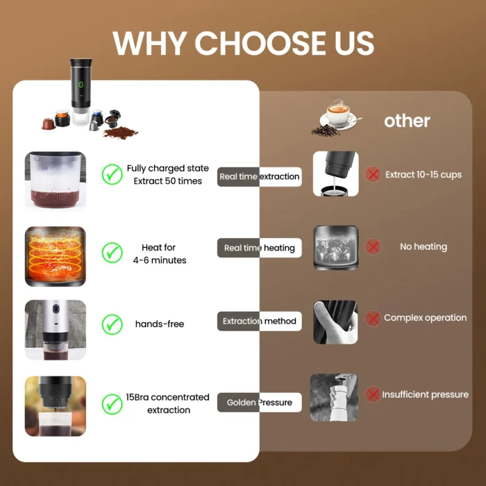 3. Portable: The portable espresso machine is suitable for various occasions, easy to carry, and can be brewed directly.