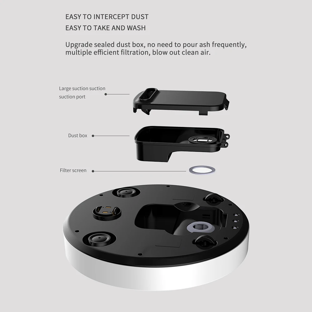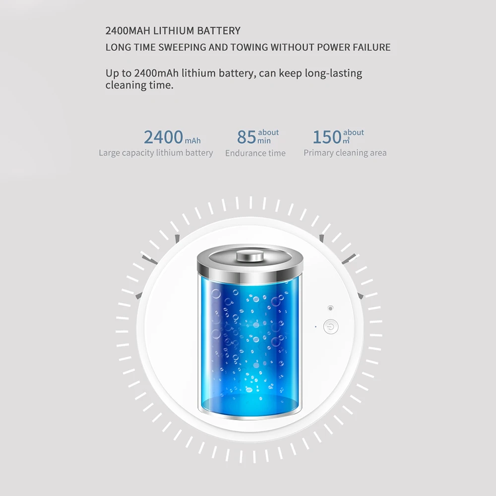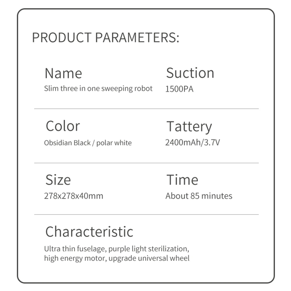 1.Ultra-thin body, purple light sterilization, high energy motor, upgraded universal wheel, sweeping robot in one