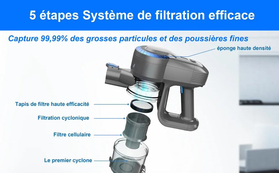 Features:6-in-1 Versatility, 2200mAh Battery, 5-Stage Filtration, Ultra Lightweigh Design, Two Storage Ways, LED Headlight Brush, 65db Ultra Quiet, Up to 40 Mins Runtime